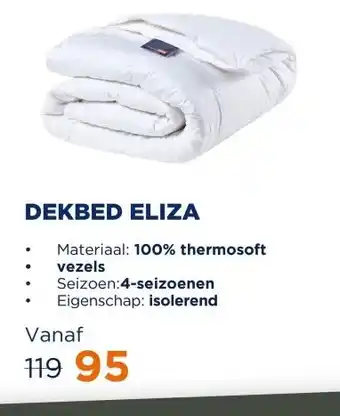 De Dekbed Eliza 100% thermosoft | 4-seizoenen is momenteel met korting verkrijgbaar bij TotaalBED. Hier vind je alle details over prijs, geldigheidsduur en actievoorwaarden. Vergeet niet om ook andere aanbiedingen en deals voor Dekbed Eliza 100% thermosoft | 4-seizoenen te bekijken zodat je zeker weet dat je de beste prijs betaalt. De kortingsactie loopt van 19-12-2025 tot 26-12-2025. Is de actie inmiddels verlopen? Geen zorgen, vergelijk dan soortgelijke aanbiedingen of volg de productcategorie voor toekomstige prijsverlagingen. Zo koop je altijd met voordeel.Veelgestelde vragen over Dekbed Eliza 100% thermosoft | 4-seizoenen