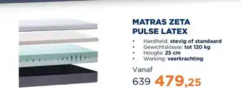 De prijs van de Matras Zeta Pulse-latex | 70 x 200 cm | Standaard kan ook teruggevonden worden hierboven op de pagina, samen met de datum van wanneer de aanbieding beschikbaar is. Ook kun je de prijzen in de huidige TotaalBED folder of op de TotaalBED website controleren. De aanbiedingen verzekeren je van het kopen van de TotaalBED producten voor de laagste prijs.