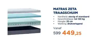 De prijs van de Matras Zeta Traagschuim | 70 x 200 cm | Stevig kan ook teruggevonden worden hierboven op de pagina, samen met de datum van wanneer de aanbieding beschikbaar is. Ook kun je de prijzen in de huidige TotaalBED folder of op de TotaalBED website controleren. De aanbiedingen verzekeren je van het kopen van de TotaalBED producten voor de laagste prijs.