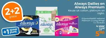 De aanbieding is verkrijgbaar in verschillende winkels, bekijk alle producten om de goedkoopste Always Dailies en Always Premium te krijgen. Als je graag wilt kijken of het artikel met meer korting te koop is in een andere winkel, bekijk de categorie 'Drogist en Parfumerie'. Wellicht vind je deze aanbiedingen ook interessant: Always, Always Dailies en Always Discreet, Always Dailies cotton protection normal & Always.