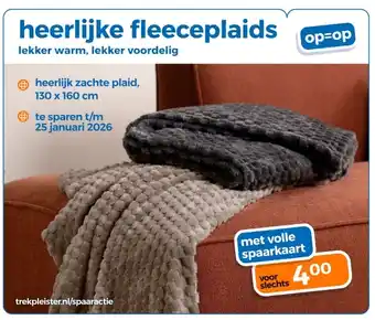 De prijs van de heerlijke fleeceplaids lekker warm, lekker voordelig kan ook teruggevonden worden hierboven op de pagina, samen met de datum van wanneer de aanbieding beschikbaar is. Ook kun je de prijzen in de huidige Trekpleister folder of op de Trekpleister website controleren. De aanbiedingen verzekeren je van het kopen van de Trekpleister producten voor de laagste prijs.
