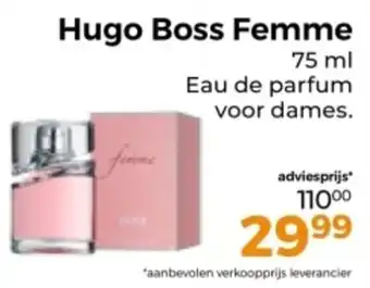 De prijs van de Hugo Boss Femme kan ook teruggevonden worden hierboven op de pagina, samen met de datum van wanneer de aanbieding beschikbaar is. Ook kun je de prijzen in de huidige Trekpleister folder of op de Trekpleister website controleren. De aanbiedingen verzekeren je van het kopen van de Trekpleister producten voor de laagste prijs.