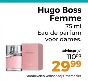 De prijs van de Hugo Boss Femme kan ook teruggevonden worden hierboven op de pagina, samen met de datum van wanneer de aanbieding beschikbaar is. Ook kun je de prijzen in de huidige Trekpleister folder of op de Trekpleister website controleren. De aanbiedingen verzekeren je van het kopen van de Trekpleister producten voor de laagste prijs.