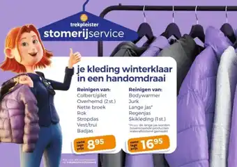 Laat je kleding winterklaar maken bij onze stomerijservice van Trekpleister. Voor een vaste lage prijs van 8.95 reinigen wij onder andere colberts, overhemden, nette broeken, rokken, stropdassen, vesten en truien. Ook kun je kiezen voor het reinigen van bodywarmers, jurken, lange jassen, regenjassen en skikleding voor slechts 16.95. Al deze kledingstukken worden bovendien waterafstotend gemaakt, met uitzondering van de lange jas. Zo ben je helemaal klaar voor de winter! Kijk voor alle voorwaarden op trekpleister.nl/stomerij en laat je kleding professioneel reinigen en winterklaar maken in een handomdraai.