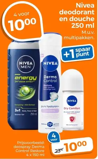 De aanbieding is verkrijgbaar in verschillende winkels, bekijk alle producten om de goedkoopste Nivea deodorant en douche te krijgen. Als je graag wilt kijken of het artikel met meer korting te koop is in een andere winkel, bekijk de categorie 'Drogist en Parfumerie'. Wellicht vind je deze aanbiedingen ook interessant: Nivea deodorant en douche 250 ml, Nivea douche & Sanex deodorant en douche.