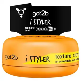 De aanbieding is verkrijgbaar in verschillende winkels, bekijk alle producten om de goedkoopste Schwarzkopf Got2b I Styler Texture Clay te krijgen. Als je graag wilt kijken of het artikel met meer korting te koop is in een andere winkel, bekijk de categorie 'Drogist en Parfumerie'. Wellicht vind je deze aanbiedingen ook interessant: Schwarzkopf Got2b Phenomenal Texture Clay, Got2b Gentleman Texture Clay 100 ML & Syoss Texture Clay.