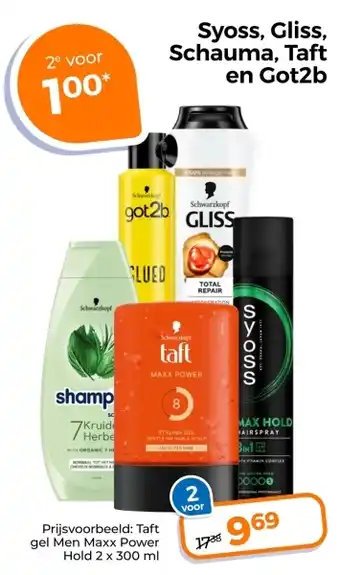 Trekpleister biedt naast de Syoss, Gliss, Schauma, Taft en Got2b een ruime collectie producten aan. Houd de wekelijkse Trekpleister folder in de gaten om de beste aanbiedingen en acties te vinden. Naast Syoss, Gliss, Schauma, Taft en Got2b, kunt u ook de volgende aanbiedingen vinden: Syoss, Taft en got2b styling, Got2B, Syoss styling en Taft & Syoss, Taft en got2b styling.