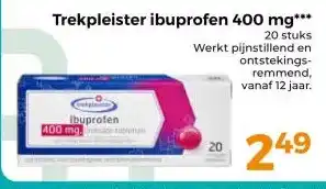 De prijs van de Trekpleister ibuprofen 400 mg kan ook teruggevonden worden hierboven op de pagina, samen met de datum van wanneer de aanbieding beschikbaar is. Ook kun je de prijzen in de huidige Trekpleister folder of op de Trekpleister website controleren. De aanbiedingen verzekeren je van het kopen van de Trekpleister producten voor de laagste prijs.