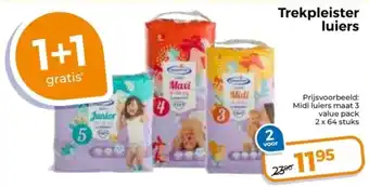 Profiteer nu van de geweldige aanbieding van Trekpleister luiers: 1+1 gratis! Kies uit verschillende maten zoals Maxi, Midi en Junior. Bijvoorbeeld een value pack Midi luiers maat 3, 2 x 64 stuks voor slechts 17,95. De luiers zijn van uitstekende kwaliteit en zorgen voor een comfortabele pasvorm voor je kleintje. Dankzij de absorberende kern blijft je baby tot wel 12 uur lang droog en beschermd. De elastische zijkanten en flexibele sluitingen zorgen voor een optimale bewegingsvrijheid. Profiteer van deze aanbieding en sla snel je voorraad luiers in bij Trekpleister. Zo ben je altijd voorbereid op elke luierwissel en bespaar je ook nog eens geld!