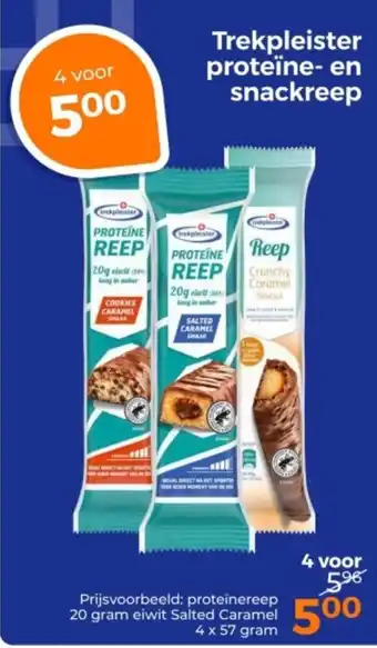 Trekpleister biedt naast de Trekpleister proteïne en snackreep een ruime collectie producten aan. Houd de wekelijkse Trekpleister folder in de gaten om de beste aanbiedingen en acties te vinden. Naast Trekpleister proteïne en snackreep, kunt u ook de volgende aanbiedingen vinden: Trekpleister Crunchy Caramel Snackreep, Trekpleister gezichtsreiniging & Trekpleister shampoo.