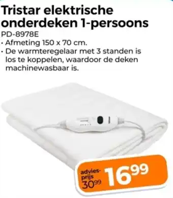 De aanbieding is verkrijgbaar in verschillende winkels, bekijk alle producten om de goedkoopste Tristar elektrische onderdeken te krijgen. Als je graag wilt kijken of het artikel met meer korting te koop is in een andere winkel, bekijk de categorie 'Drogist en Parfumerie'. Wellicht vind je deze aanbiedingen ook interessant: Tristar elektrische onderdeken 2-persoons, Tristar elektrische onderdeken PD-3855E & Tristar elektrische onderdeken 2 persoons.