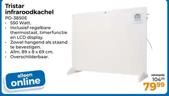 De aanbieding is verkrijgbaar in verschillende winkels, bekijk alle producten om de goedkoopste Tristar infraroodkachel te krijgen. Als je graag wilt kijken of het artikel met meer korting te koop is in een andere winkel, bekijk de categorie 'Drogist en Parfumerie'. Wellicht vind je deze aanbiedingen ook interessant: Tristar infraroodkachel, Tristar Infraroodkachel PD-3850E & Tristar ventilatorkachel.