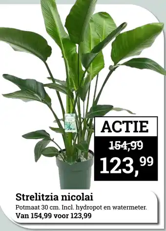 De prijs van de Strelitzia nicolai kan ook teruggevonden worden hierboven op de pagina, samen met de datum van wanneer de aanbieding beschikbaar is. Ook kun je de prijzen in de huidige Tuincentrum Osdorp folder of op de Tuincentrum Osdorp website controleren. De aanbiedingen verzekeren je van het kopen van de Tuincentrum Osdorp producten voor de laagste prijs.