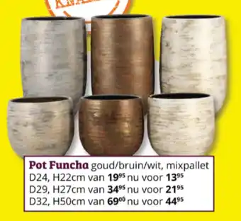 De prijs van de Pot Funcha kan ook teruggevonden worden hierboven op de pagina, samen met de datum van wanneer de aanbieding beschikbaar is. Ook kun je de prijzen in de huidige Tuinland folder of op de Tuinland website controleren. De aanbiedingen verzekeren je van het kopen van de Tuinland producten voor de laagste prijs.
