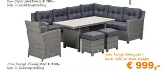 Nu in de aanbieding bij Tuinmeubelland: jaruJaru lounge dining set / bank, tafel en twee krukjes✅ Actie geldig van 19-04 t/m 7-05.