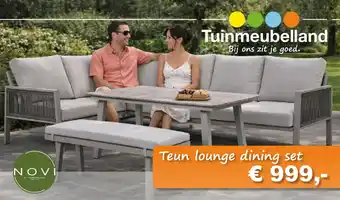 De prijs van de Teun Lounge Dining Set kan ook teruggevonden worden hierboven op de pagina, samen met de datum van wanneer de aanbieding beschikbaar is. Ook kun je de prijzen in de huidige Tuinmeubelland folder of op de Tuinmeubelland website controleren. De aanbiedingen verzekeren je van het kopen van de Tuinmeubelland producten voor de laagste prijs.
