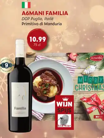 Geniet van de heerlijke A6MANI FAMILIA Primitivo di Manduria uit Puglia, Italië. Deze wijn is perfect voor de feestdagen en kost slechts €10.99 per fles van 75 cl. De A6MANI FAMILIA is een rijke en volle rode wijn met tonen van rijp rood fruit en kruiden. Deze wijn is ideaal om te combineren met vleesgerechten, stoofschotels en harde kazen. Proost op een gezellige avond met vrienden en familie en bestel deze heerlijke Primitivo di Manduria nu. Klik hier om de A6MANI FAMILIA te bestellen en maak van jouw kerst een onvergetelijke ervaring. WW WIJN SPIJS wenst je alvast een MERRY CHRISTMAS!