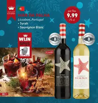 Ontdek de heerlijke Mar Da Palha wijnen uit Lissabon, Portugal. Deze rode wijn, gemaakt van Syrah druiven, en witte wijn, gemaakt van Sauvignon Blanc druiven, zijn echte aanraders. Beide wijnen zijn beoordeeld met een 8.5 door Harold Hamersma. Geniet van de smaakvolle combinatie van Mar Da Palha wijnen met diverse gerechten dankzij het WIJN SPIJS advies. De Mar Da Palha wijnen zijn verkrijgbaar voor slechts 9.99 per fles van 75 cl, exclusief bij uw topSlijter. Klik hier om uw Mar Da Palha wijnen te bestellen en laat u verrassen door de unieke smaken van de Atlantische kust van Portugal. Proost op het goede leven met Mar Da Palha!
