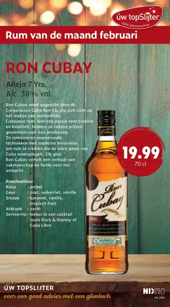 De prijs van de Ron cubay kan ook teruggevonden worden hierboven op de pagina, samen met de datum van wanneer de aanbieding beschikbaar is. Ook kun je de prijzen in de huidige Uw topSlijter folder of op de uw topSlijter website controleren. De aanbiedingen verzekeren je van het kopen van de uw topSlijter producten voor de laagste prijs.