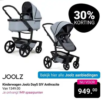 Profiteer nu van een geweldige aanbieding op de Kinderwagen Joolz Day5 SIY Anthracite! Met maar liefst 30% korting is deze prachtige kinderwagen nu verkrijgbaar voor slechts €949.00. Daarbij ontvang je ook nog eens 949 spaarpunten. De Joolz Day5 SIY Anthracite is een stijlvolle en praktische kinderwagen die perfect is voor jouw kleintje. Met zijn luxe uitstraling en handige functies zoals verstelbare duwbeugel en ruime boodschappenmand, is deze kinderwagen een must-have voor elke ouder. Bekijk hier alle Joolz aanbiedingen en profiteer van deze geweldige deal! Wees er snel bij, want op = op!