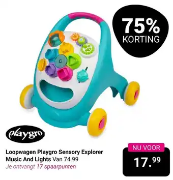 NU VOOR 75% KORTING! Ontdek de wereld van spelen en leren met de Loopwagen Playgro Sensory Explorer Music And Lights. Deze interactieve loopwagen stimuleert de zintuigen van je kind met kleurrijke lichten, vrolijke muziek en leuke geluiden. Met de stevige handgreep kan je kind veilig rondlopen en de wereld verkennen. De loopwagen is geschikt voor kinderen vanaf 6 maanden en bevordert de motorische vaardigheden en het evenwicht. Bestel nu voor slechts 17.99 en ontvang ook nog eens 17 spaarpunten! Mis deze geweldige aanbieding niet en geef je kind uren speelplezier met de Loopwagen Playgro Sensory Explorer Music And Lights Van 74.99.