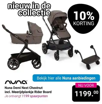 Nieuw in de collectie: de Nuna Demi Next Chestnut kinderwagen inclusief Meerijdplankje Rider Board. Profiteer nu van 10% KORTING en ontvang 1199 spaarpunten bij aankoop. Deze luxe kinderwagen van Nuna biedt comfort en gemak voor zowel ouder als kind. Met het handige meerijdplankje kunnen oudere broers en zussen ook makkelijk meerijden. De Nuna Demi Next Chestnut is een stijlvolle en praktische keuze voor ouders die op zoek zijn naar kwaliteit en design. Bekijk hier alle Nuna aanbiedingen en bestel deze complete set vandaag nog voor slechts 1199.00. Mis deze kans niet en geniet van het gemak en comfort van de Nuna Demi Next Chestnut!