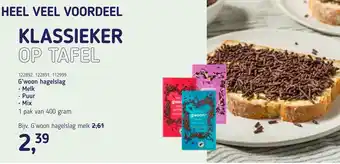 De prijs van de G'woon hagelslag kan ook teruggevonden worden hierboven op de pagina, samen met de datum van wanneer de aanbieding beschikbaar is. Ook kun je de prijzen in de huidige Van Hoeckel folder of op de Van Hoeckel website controleren. De aanbiedingen verzekeren je van het kopen van de Van Hoeckel producten voor de laagste prijs.