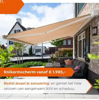 De prijs van de Knikarmscherm kan ook teruggevonden worden hierboven op de pagina, samen met de datum van wanneer de aanbieding beschikbaar is. Ook kun je de prijzen in de huidige Verasol folder of op de Verasol website controleren. De aanbiedingen verzekeren je van het kopen van de Verasol producten voor de laagste prijs.