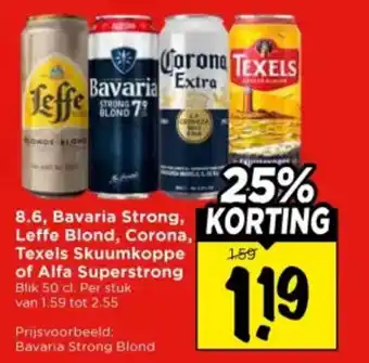 8.6, Bavaria Strong, Leffe Blond, Corona, Texels Skuumkoppe of Alfa Superstrong Blik 50 cl. aanbieding en online acties bij Vomar Voordeelmarkt