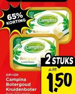 Nu in de aanbieding bij Vomar Voordeelmarkt: Campina Botergoud Kruidenboter✅ Actie geldig van 5-02 t/m 7-02.