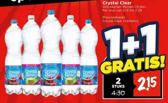 Geniet nu van de verfrissende smaak van Crystal Clear Cranberry in handige 1.5 liter flessen. Koop nu 2 flessen voor slechts 4.30, wat neerkomt op een gratis fles! Crystal Clear biedt een ruime keuze aan smaken, waaronder appel, peer en cranberry. Deze prijs is geldig voor alle soorten flessen van 1.5 liter, met prijzen variërend van 2.15 tot 2.29 per stuk. Profiteer nu van deze geweldige aanbieding en vul je koelkast met heerlijk verfrissende Crystal Clear drankjes. Verwen jezelf en je gasten met deze dorstlessende en smaakvolle drankjes, perfect voor elk moment van de dag. Mis deze kans niet en haal snel jouw Crystal Clear Cranberry in huis!