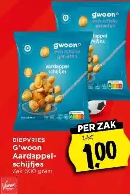 Nu in de aanbieding bij Vomar Voordeelmarkt: DIEPVRIES G'woon Aardappel- schijfjes✅ Actie geldig van 8-03 t/m 14-03.