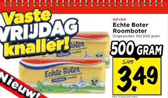 Nieuw in ons assortiment: Echte Boter Roomboter Ongezouten, verpakt in een handige rol van 500 gram. Deze vaste VRIJDAG knaller is nu verkrijgbaar voor slechts 3.49 per kilo. OP=OP, dus wees er snel bij! Maximaal 6 stuks per klant. Geniet van de pure smaak van echte boter op je boterham of in je favoriete recepten. Deze roomboter is perfect om te bakken, braden of te verwerken in sauzen. Haal nu deze kwaliteitsboter in huis en geniet van de heerlijke smaak en romige textuur. Bestel vandaag nog en profiteer van deze voordelige aanbieding. Echte Boter Roomboter Ongezouten: een echte smaakmaker voor elke keuken!