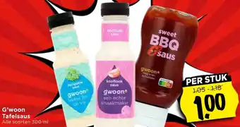 G'woon Tafelsaus is een echte smaakmaker voor bij elke maaltijd. Met keuze uit alle soorten 300 ml, zoals gwoon lekkere fris op vis, sweet BBQ saus en meer. Deze g'woon tafelsaus is verkrijgbaar voor slechts 1,05-1,18 PER STUK. Voeg een heerlijke smaak toe aan je gerechten met deze g'woon saus. Of je nu van zoet of pittig houdt, er is voor ieder wat wils. Probeer nu de g'woon Tafelsaus en maak van elke maaltijd een feestje. Bestel jouw favoriete smaak vandaag nog voor slechts 1,00 en geniet van de heerlijke toevoeging aan je gerechten.