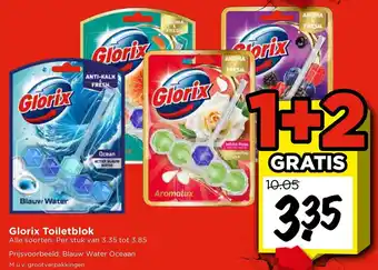 Het Glorix Toiletblok Ocean ANTI-KALK FRESH zorgt voor een frisse en schone toiletervaring. Dit toiletblok is speciaal ontworpen om kalkaanslag te voorkomen en verspreidt een heerlijke oceaan geur in uw toilet. De blauwe kleur van het blok zorgt voor een actieve reiniging bij elke spoelbeurt. Het Glorix Toiletblok is verkrijgbaar in verschillende varianten, waaronder Blauw Water Oceaan en OMA FRESH. Profiteer nu van de actie waarbij u 1 toiletblok koopt en 2 gratis krijgt. De prijs per stuk varieert van 3.35 tot 3.85, met uitzondering van grootverpakkingen. Houd uw toilet hygiënisch en fris met het Glorix Toiletblok!
