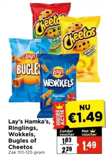 Nu in de aanbieding bij Vomar Voordeelmarkt: Lay's Hamka's, Ringlings, Wokkels, Bugles of Cheetos✅ Actie geldig van 12-02 t/m 14-02.