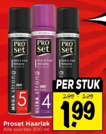 Proset Haarlak MEGA strong is de perfecte keuze voor een langdurige en krachtige fixatie van je kapsel. Met de PRO PRO PRO set formule zorgt deze haarlak ervoor dat je haar de hele dag perfect in model blijft zitten. Dankzij de Style & Care eigenschappen wordt je haar ook nog eens verzorgd en beschermd. De haarlak biedt een hold tot wel 48 uur en is geschikt voor alle haartypes. Proset Haarlak is verkrijgbaar in alle soorten voor slechts 2.99 - 3.29 per stuk. Profiteer nu van deze aanbieding en geef je haar de perfecte styling die het verdient. Bestel snel jouw Proset Haarlak MEGA strong 300 ml!