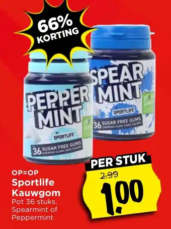 Geniet van de verfrissende smaak van Sportlife Kauwgom in een handige pot met 36 suikervrije kauwgoms. Kies uit de smaken Spearmint of Peppermint en profiteer van maar liefst 66% korting. Normaal gesproken betaal je 2,99 per stuk, maar nu slechts 1,00 zolang de voorraad strekt. Ideaal voor onderweg, na het eten of tijdens het sporten. De kauwgom is suikervrij en zorgt voor een langdurig frisse adem. Mis deze aanbieding niet en bestel snel jouw Sportlife Kauwgom Pot voordat het te laat is. Op=op! Sportlife, de perfecte keuze voor een frisse adem en een actieve levensstijl.