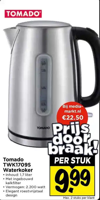 De Tomado TWK1709S Waterkoker is een stijlvolle toevoeging aan elke keuken. Met een inhoud van 1,7 liter en een vermogen van 2.200 watt, brengt deze waterkoker snel en efficiënt water aan de kook. Het ingebouwde kalkfilter zorgt ervoor dat het water schoon blijft en de smaak van je drankjes niet wordt beïnvloed. Het elegante roestvrijstalen design past perfect bij elke keukeninrichting. Bij mediamarkt.nl is deze waterkoker verkrijgbaar voor slechts €22.50 per stuk. Profiteer nu van de speciale prijs van €9.99 per stuk, maar let op: maximaal 2 stuks per klant. Haal deze Tomado waterkoker vandaag nog in huis en geniet van heerlijke warme dranken in stijl.