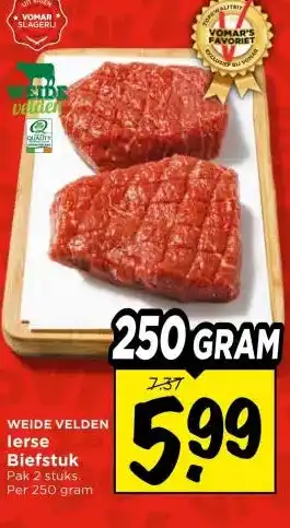 Nu in de aanbieding bij Vomar Voordeelmarkt: WEIDE VELDEN lerse Biefstuk✅ Actie geldig van 26-04 t/m 2-05.
