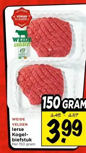Nu in de aanbieding bij Vomar Voordeelmarkt: WEIDE VELDEN lerse Kogel- biefstuk✅ Actie geldig van 1-02 t/m 7-02.