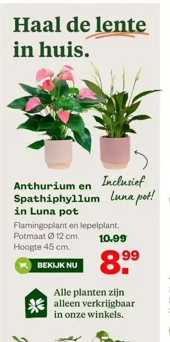 Nu in de aanbieding bij Welkoop: Anthurium en Spathiphyllum in Luna pot✅ Actie geldig van 9-03 t/m 15-03.