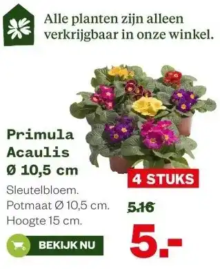 De Primula Acaulis Ø 10,5 cm is momenteel met korting verkrijgbaar bij Welkoop. Hier vind je alle details over prijs, geldigheidsduur en actievoorwaarden. Vergeet niet om ook andere aanbiedingen en deals voor Primula Acaulis Ø 10,5 cm te bekijken zodat je zeker weet dat je de beste prijs betaalt. De kortingsactie loopt van 16-02-2026 tot 22-02-2026. Is de actie inmiddels verlopen? Geen zorgen, vergelijk dan soortgelijke aanbiedingen of volg de productcategorie voor toekomstige prijsverlagingen. Zo koop je altijd met voordeel.Veelgestelde vragen over Primula Acaulis Ø 10,5 cm