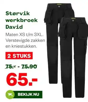 De Størvik werkbroek David is momenteel met korting verkrijgbaar bij Welkoop. Hier vind je alle details over prijs, geldigheidsduur en actievoorwaarden. Vergeet niet om ook andere aanbiedingen en deals voor Størvik werkbroek David te bekijken zodat je zeker weet dat je de beste prijs betaalt. De kortingsactie loopt van 20-04-2026 tot 26-04-2026. Is de actie inmiddels verlopen? Geen zorgen, vergelijk dan soortgelijke aanbiedingen of volg de productcategorie voor toekomstige prijsverlagingen. Zo koop je altijd met voordeel.Veelgestelde vragen over Størvik werkbroek David