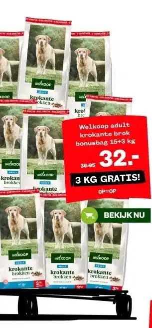 Nu in de aanbieding bij Welkoop: Welkoop adult krokante brok bonusbag✅ Actie geldig van 5-01 t/m 11-01.