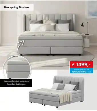 De prijs van de Boxspring Marina kan ook teruggevonden worden hierboven op de pagina, samen met de datum van wanneer de aanbieding beschikbaar is. Ook kun je de prijzen in de huidige Woonsquare Slaapfolder of op de Woonsquare website controleren. De aanbiedingen verzekeren je van het kopen van de Woonsquare producten voor de laagste prijs.