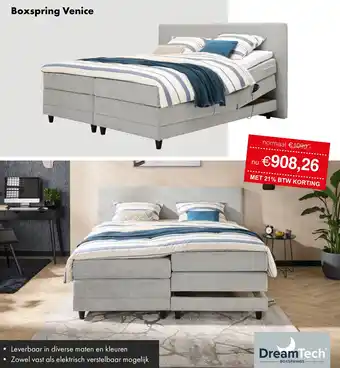 De Boxspring Venice is een luxe bed van DreamTech, leverbaar in diverse maten en kleuren. Deze boxspring is zowel vast als elektrisch verstelbaar. Normaal kost deze boxspring €1099,-, maar nu profiteer je van 21% BTW korting en betaal je slechts €908,26. Met de Boxspring Venice geniet je van optimaal slaapcomfort en een stijlvolle uitstraling in je slaapkamer. De hoogwaardige kwaliteit zorgt voor een goede nachtrust en een uitgerust gevoel in de ochtend. Haal nu jouw eigen Boxspring Venice in huis en ervaar het verschil. Bestel snel en geniet binnenkort van een heerlijke nachtrust op jouw nieuwe boxspring.