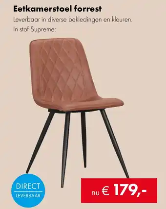 De eetkamerstoel Forrest is een stijlvolle toevoeging aan je eetkamer. Deze stoel is leverbaar in diverse bekledingen en kleuren, waardoor je hem perfect kunt afstemmen op jouw interieur. De stof Supreme zorgt voor een luxe uitstraling en is van hoge kwaliteit. Dankzij het tijdloze design past de eetkamerstoel Forrest in zowel moderne als klassieke interieurs. Bovendien is deze stoel direct leverbaar, zodat je snel kunt genieten van extra comfort aan de eettafel. Of je nu een grote eettafel hebt of juist een knusse eethoek, de eetkamerstoel Forrest is een praktische en stijlvolle keuze. Kies voor kwaliteit en comfort met de eetkamerstoel Forrest.