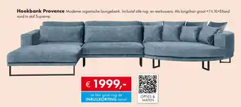 Woonsquare biedt naast de Hoekbank Provence een ruime collectie producten aan. Houd de wekelijkse Woonsquare Slaapfolder in de gaten om de beste aanbiedingen en acties te vinden. Naast Hoekbank Provence, kunt u ook de volgende aanbiedingen vinden: Hoekbank Moscato, Hoekbank Arantio & Hoekbank Moscato.