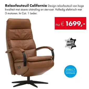 Deze Relaxfauteuil California is nu in de aanbieding bij Woonsquare. Op deze pagina vind je alle informatie over actuele prijzen, actievoorwaarden en looptijd. Vergelijk ook andere relevante aanbiedingen en acties rondom Relaxfauteuil California, zodat je altijd de slimste keuze maakt. De aanbieding loopt van 09-03-2026 tot en met 14-03-2026. Is de actie verlopen? Geen probleem – vergelijkbare deals vind je altijd via deze pagina. Volg eventueel de productcategorie om automatisch op de hoogte te blijven van nieuwe aanbiedingen of prijsdalingen voor Relaxfauteuil California.Veelgestelde vragen over Relaxfauteuil California